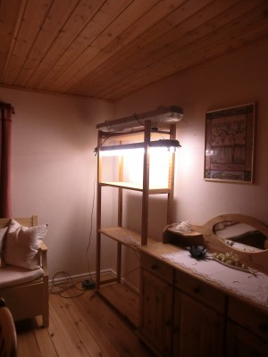 Platsbristen för frösådder inne ska vi nog råda bot på i år också. Mannen kom på att vi hade gamla Ivar-hyllor på loftet. Provade med en i hörnet i köket, nu ska vi bara hämta ner den andra också. Lysrören hade vi sen förut, ett under var hylla får det bli.
